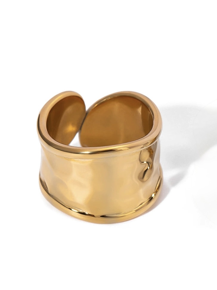A modern wide-band ring with a hammered texture for a minimalist yet bold style.