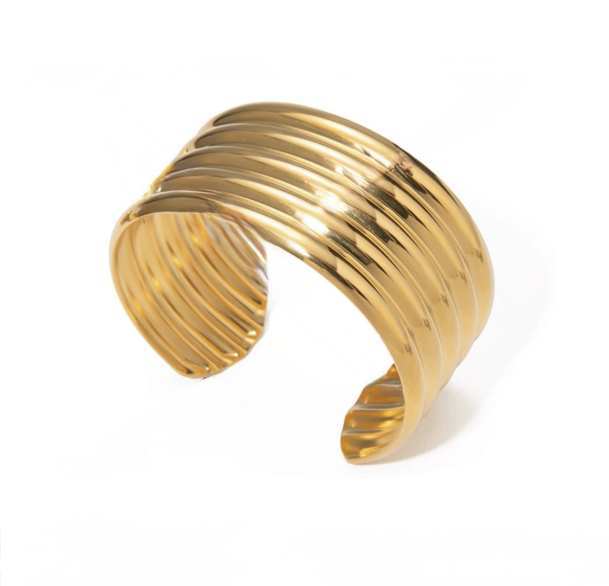 Statement cuff bracelet with ripple grooves and a high-polish finish. Adjustable, waterproof, and hypoallergenic.