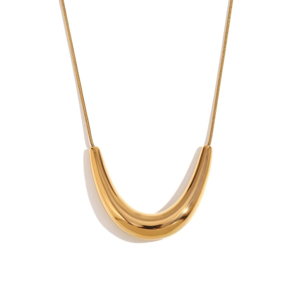 Elegant minimalist necklace featuring a smooth arc-shaped pendant on a sleek snake bone chain. Designed for everyday sophistication — waterproof, hypoallergenic, and available in both gold and silver finishes.