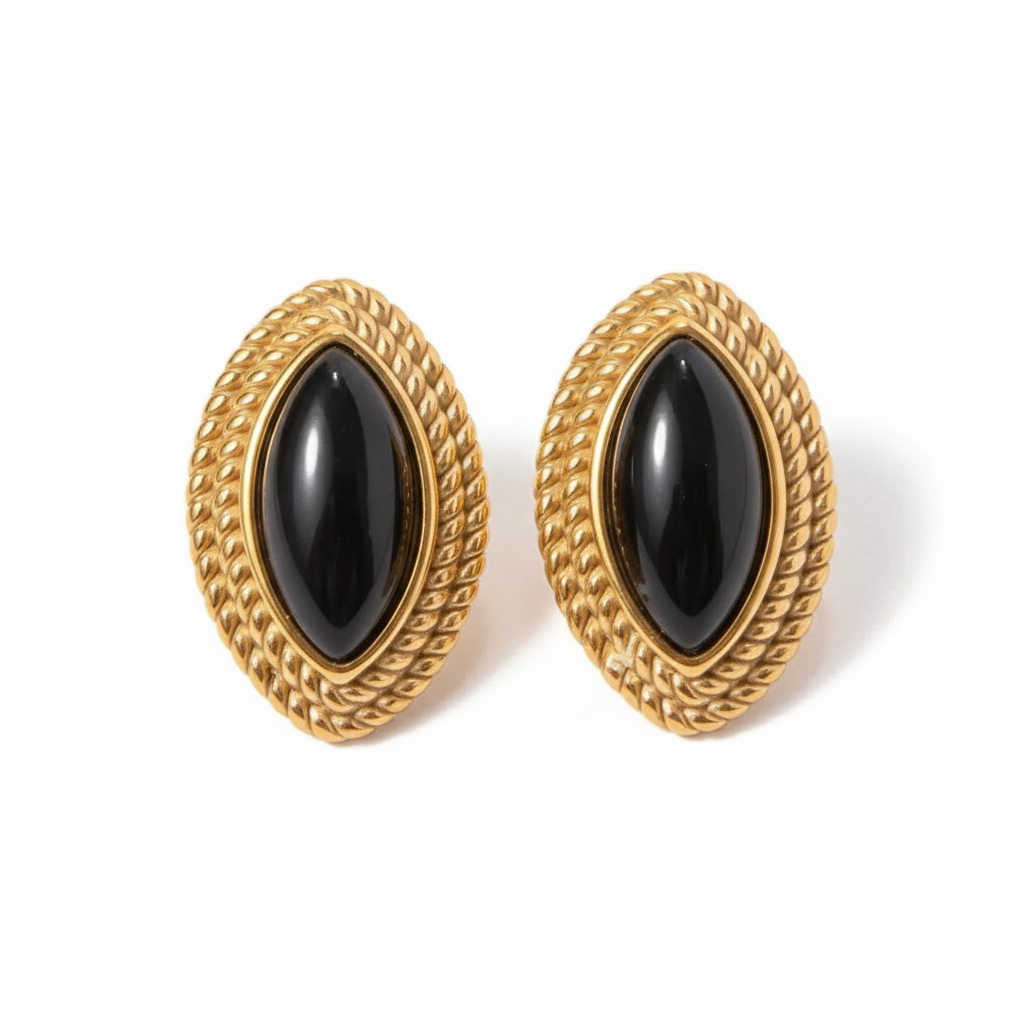 These striking stud earrings feature a sleek, jet-black marquise centerpiece framed by an intricate, rope-textured golden border. Their elegant vintage-inspired silhouette makes them a sophisticated choice for both formal occasions and elevated daily wear.