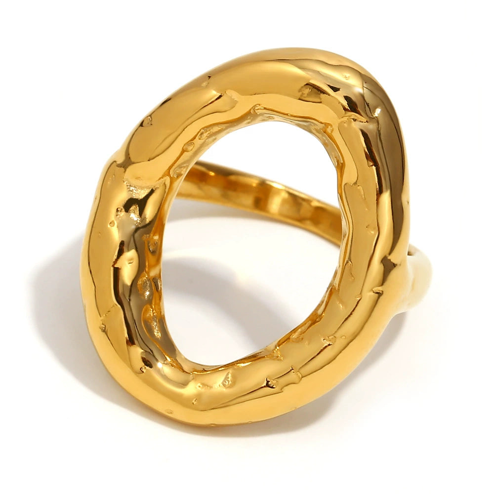 Modern gold ring featuring a twisted organic design with a sculpted, high-polish finish. A lightweight statement piece that adds a subtle touch of luxury to any look. Waterproof and hypoallergenic.