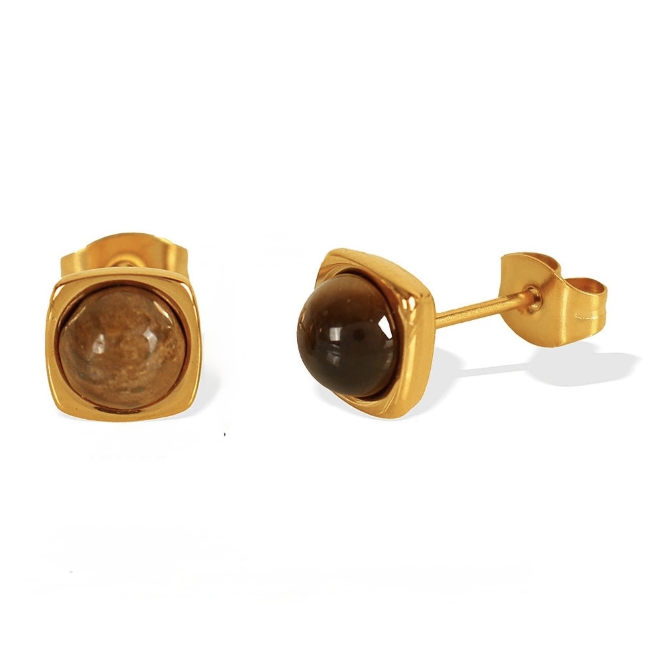 Subtle yet sophisticated, these petite stud earrings feature a smooth, cabochon-cut Tiger’s Eye stone set within a minimalist square golden frame. They are the perfect everyday accessory for those who appreciate natural gemstones and understated elegance.