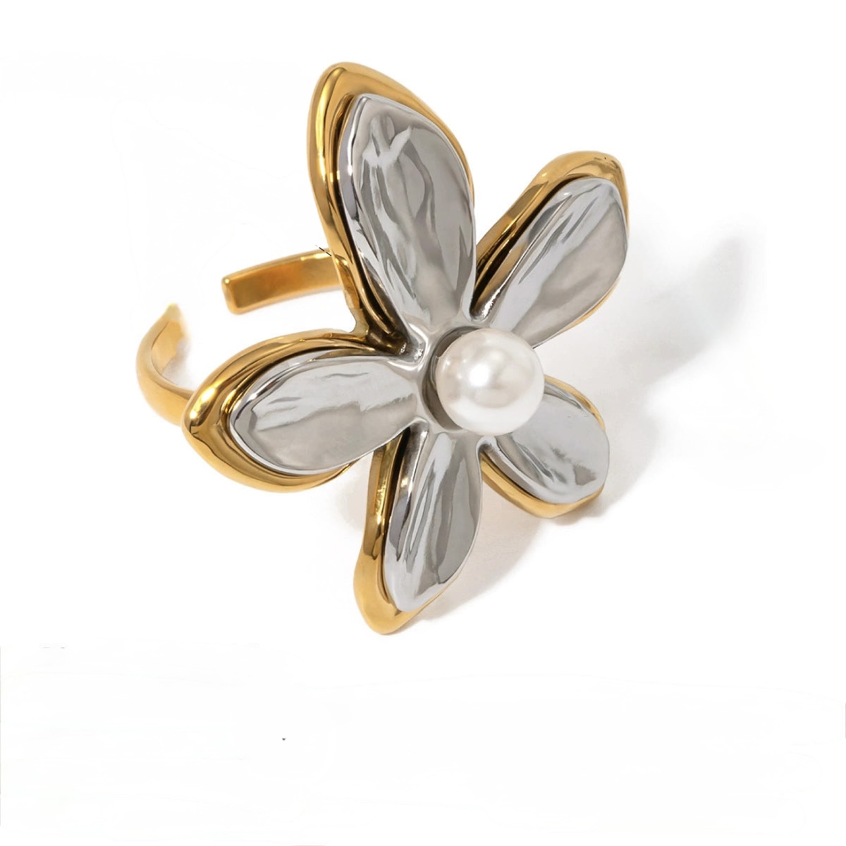 Elegant flower design in silver and gold tones with a central pearl. Adjustable and eye-catching.