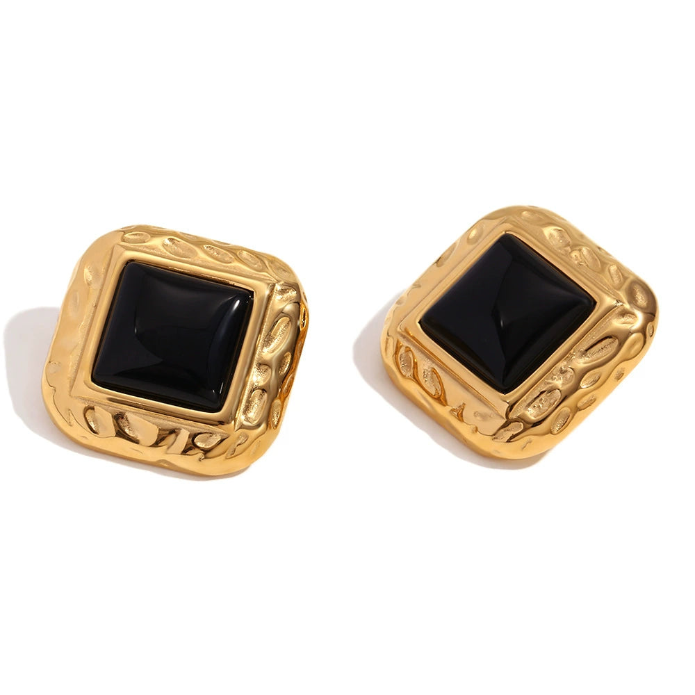Elegant statement studs with a glossy black stone framed in hammered gold texture.
