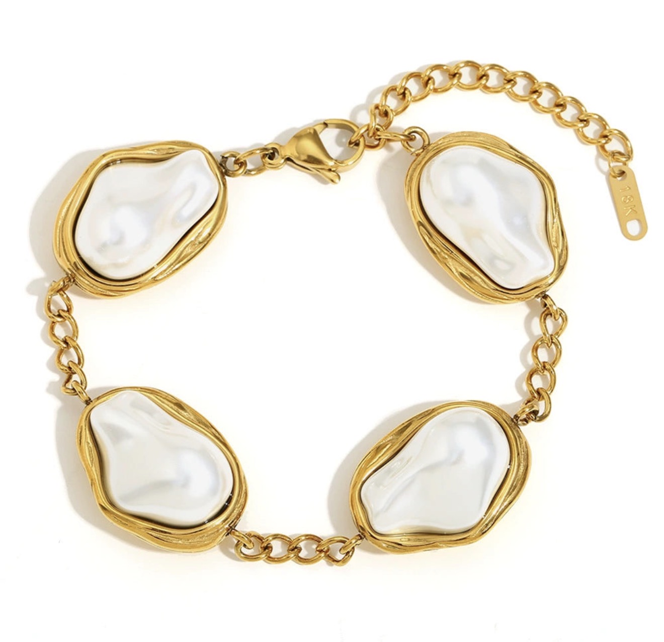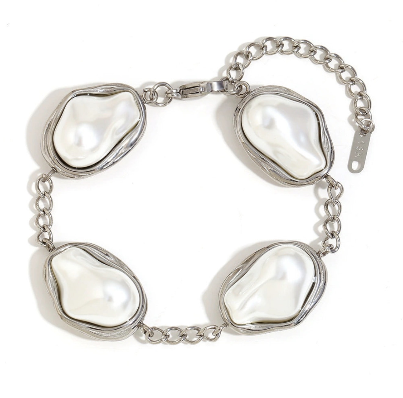 Elevate your jewelry collection with this stunning fusion of classic elegance and modern edge. Featuring four uniquely shaped baroque pearls encased in fluid, organic metal frames, this bracelet is a true wearable piece of art.