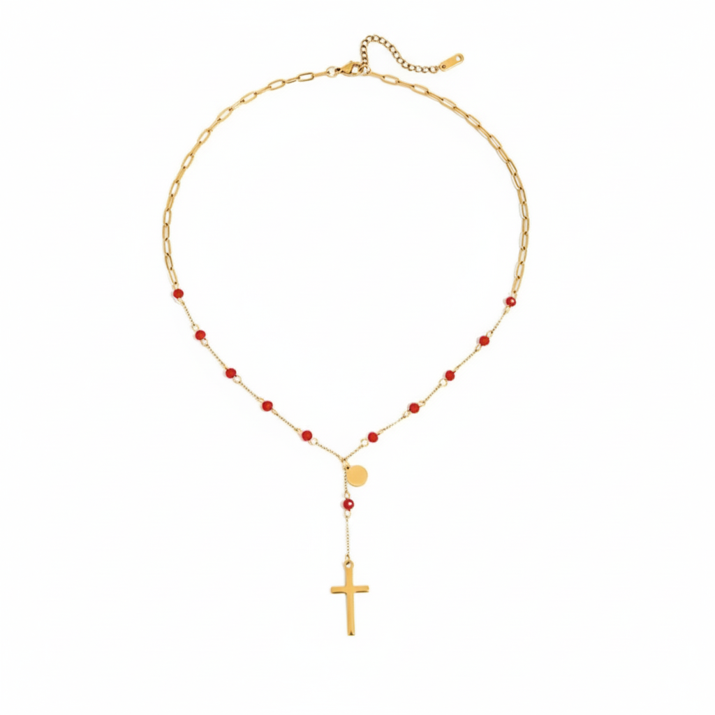 A classic religious-inspired design with a modern twist. This rosary-style necklace combines a gold link chain with delicate red beads and a minimalist cross pendant.